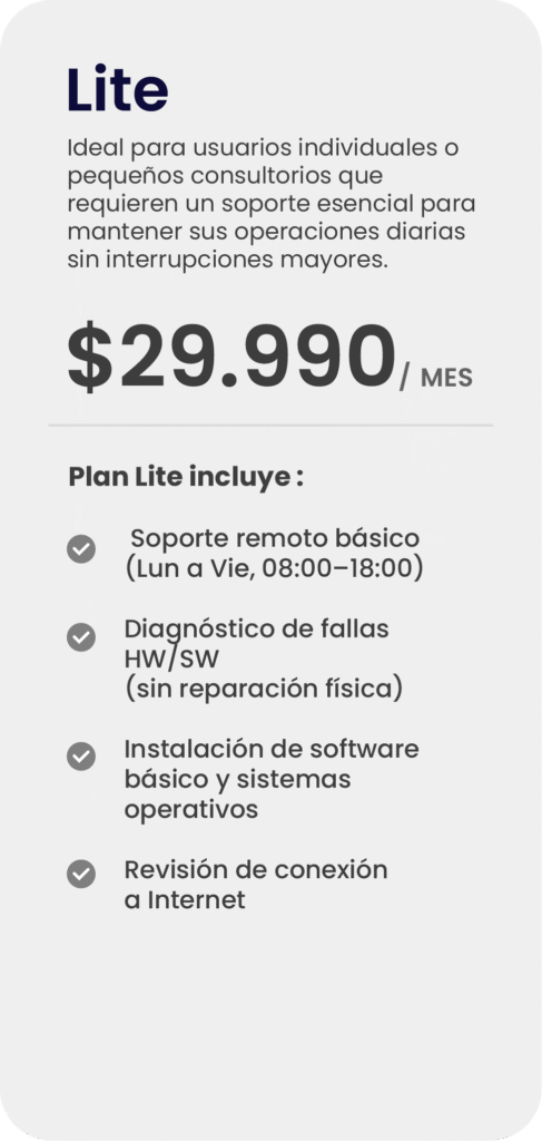 Nuestro servicio de Soporte TI se adapta a tus necesidades con modalidades presencial, remota o híbrida. Ya sea en el lugar o con soporte remoto y visitas periódicas, garantizamos el funcionamiento óptimo de tu infraestructura tecnológica. Nuestro equipo de expertos resuelve rápidamente problemas técnicos, brindando soluciones eficaces y personalizadas para mantener tus sistemas operando sin interrupciones.